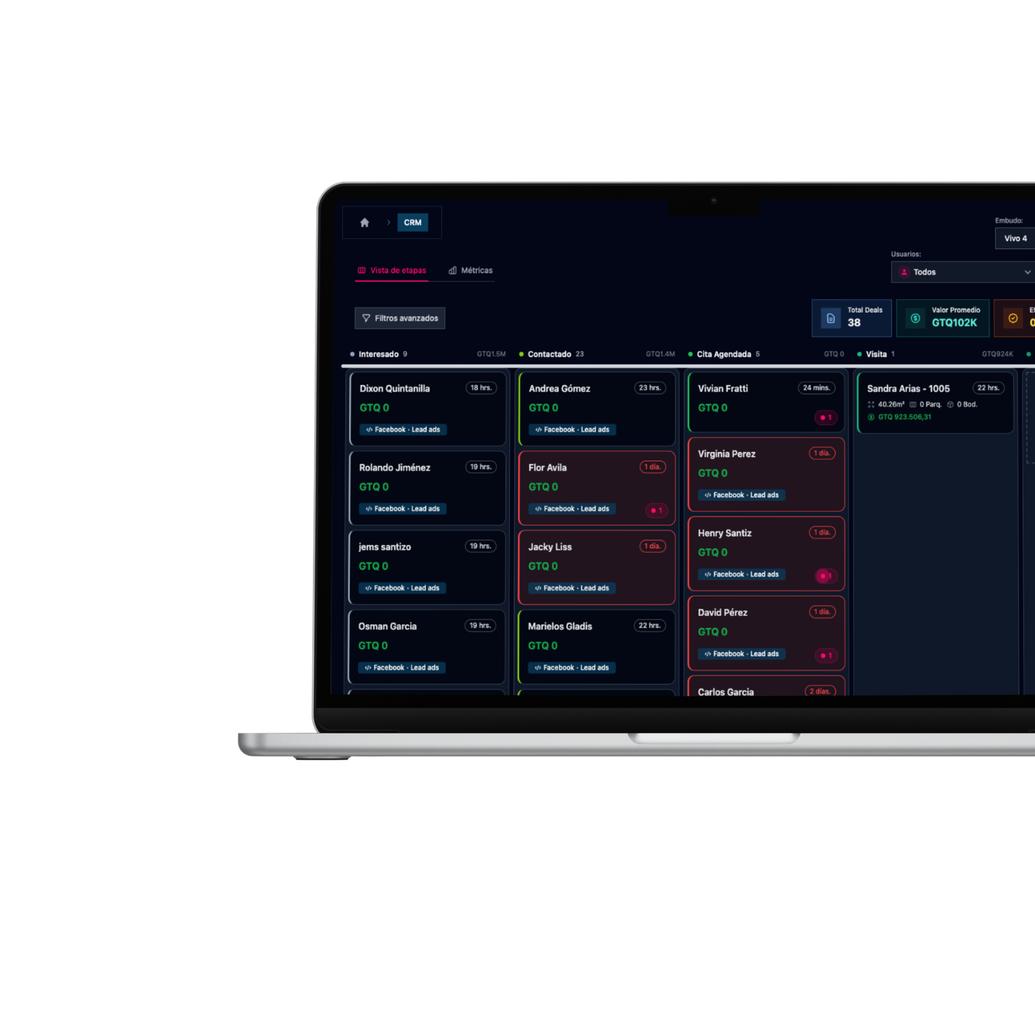 Gestiona leads, seguimiento comercial y actividad del equipo sin desconectar ventas del resto de la operación.